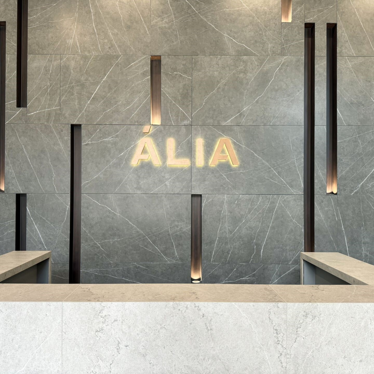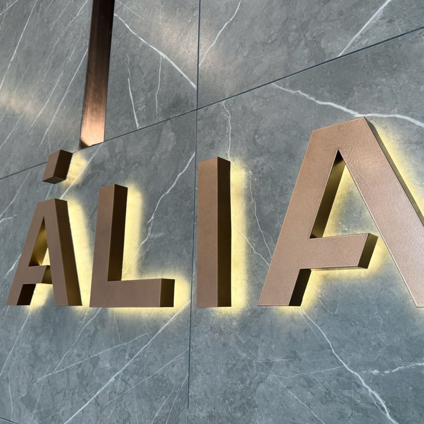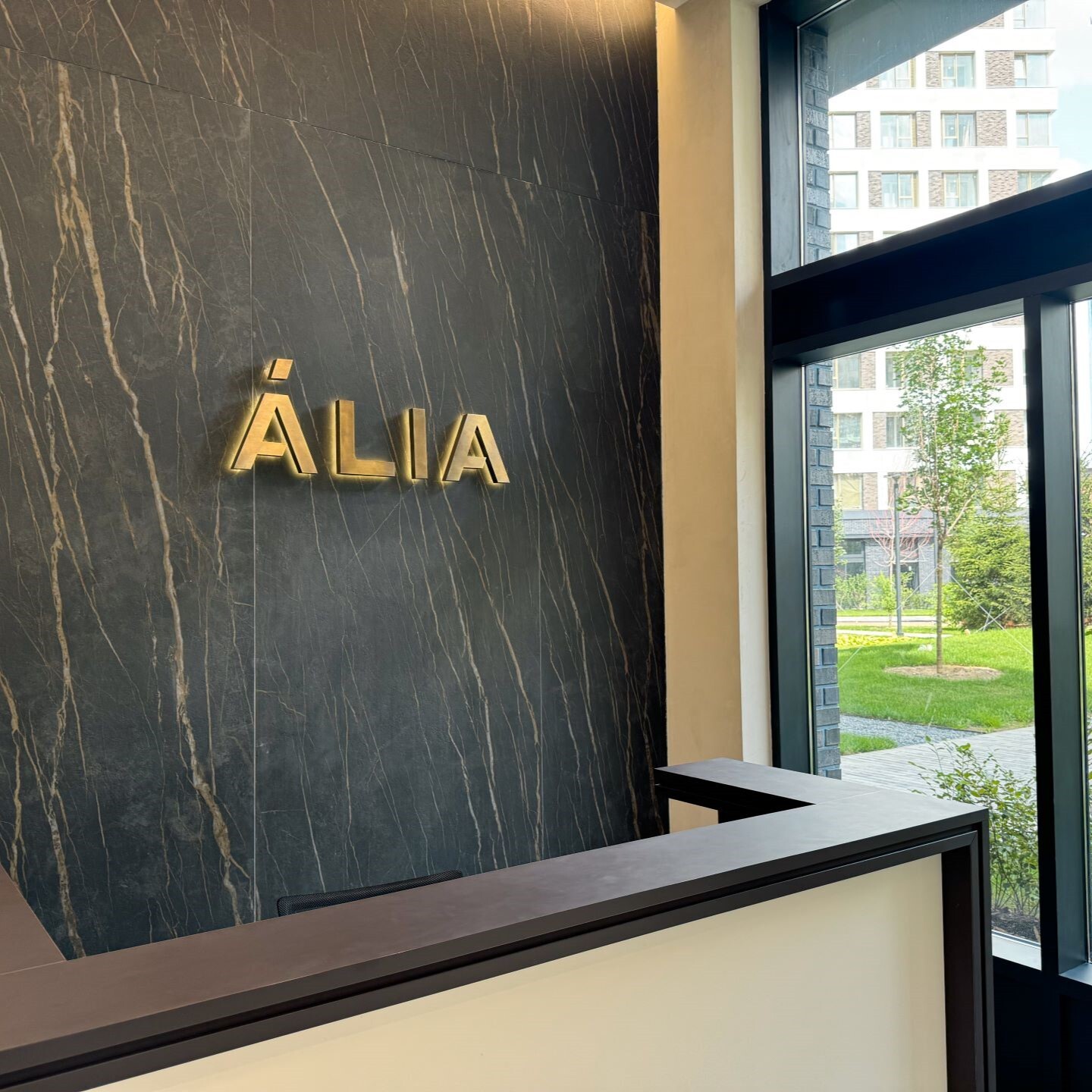 Возле каждой стойки ресепшн установлены объемные логотипы с контражурной подсветкой. Материалы исполнения логотипов латунь и нержавеющая сталь. Цвет материала был выбран исходя из отделочных материалов лобби.
