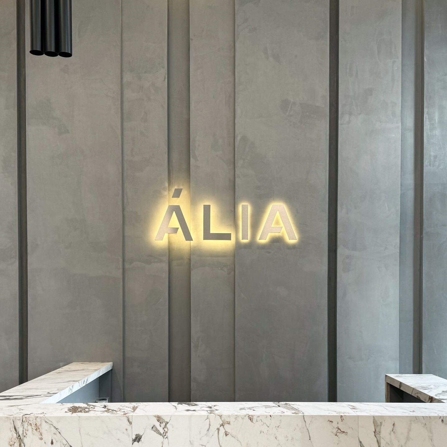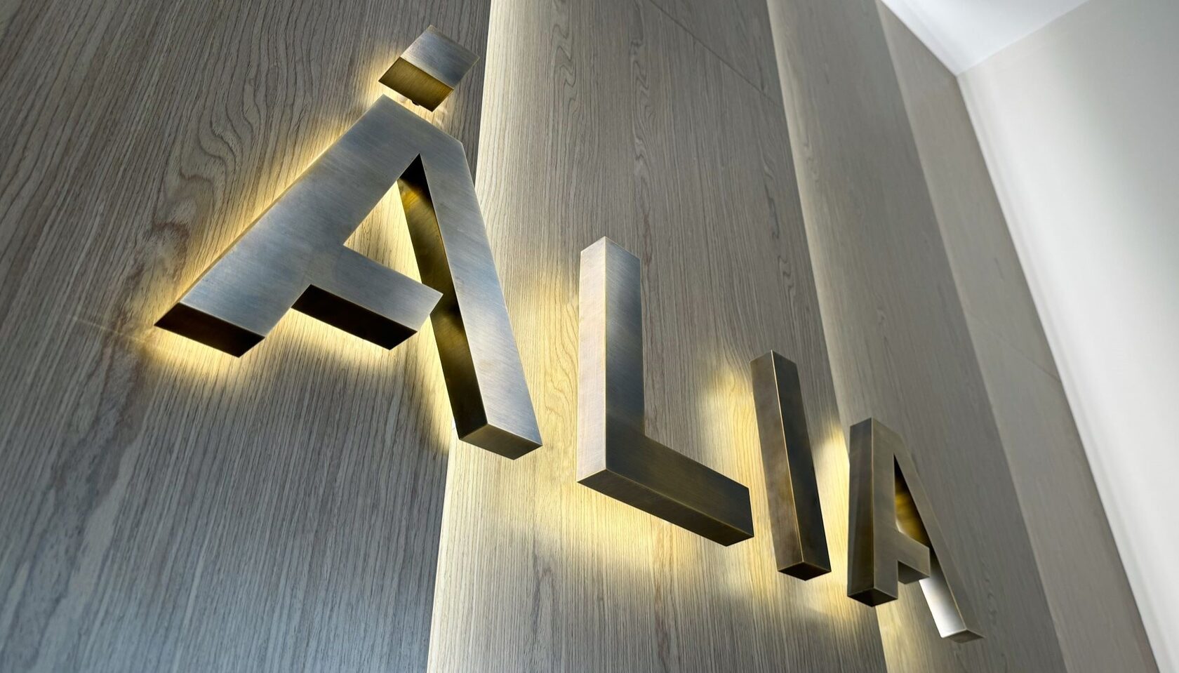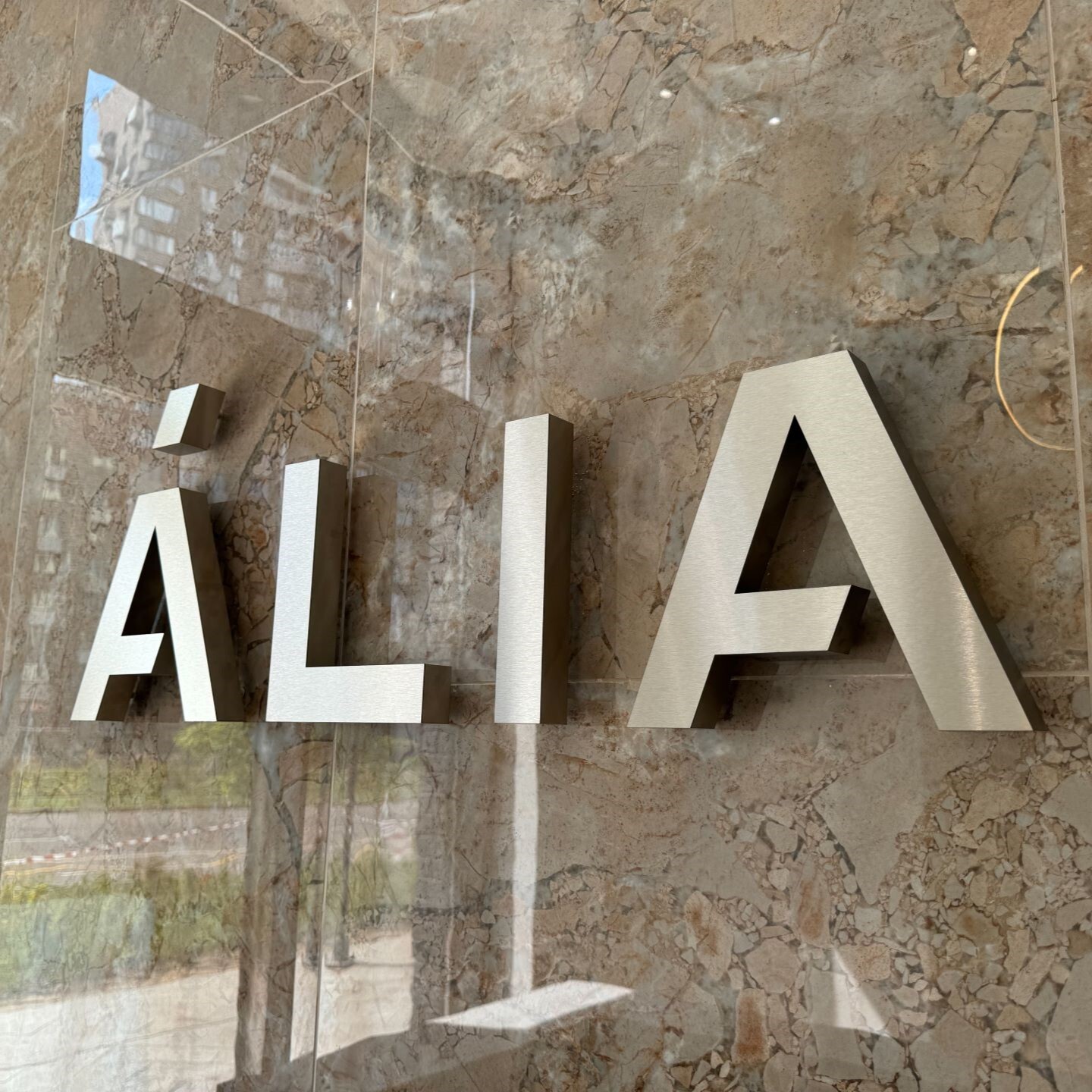 Возле каждой стойки ресепшн установлены объемные логотипы с контражурной подсветкой. Материалы исполнения логотипов латунь и нержавеющая сталь. Цвет материала был выбран исходя из отделочных материалов лобби.